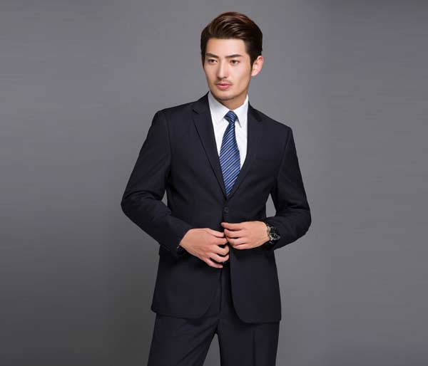 蓝色西装是商务西装的基本色,因此这种西装至少要有一件。代表性的款式有单色和条纹两种。单色给人感觉比条纹更加正式。而条纹虽然不像单色那么正式,但能带出西装整体的效果,让身形看起来更挺拔,乍看之下身材也较纤细。蓝色西装ZY-01